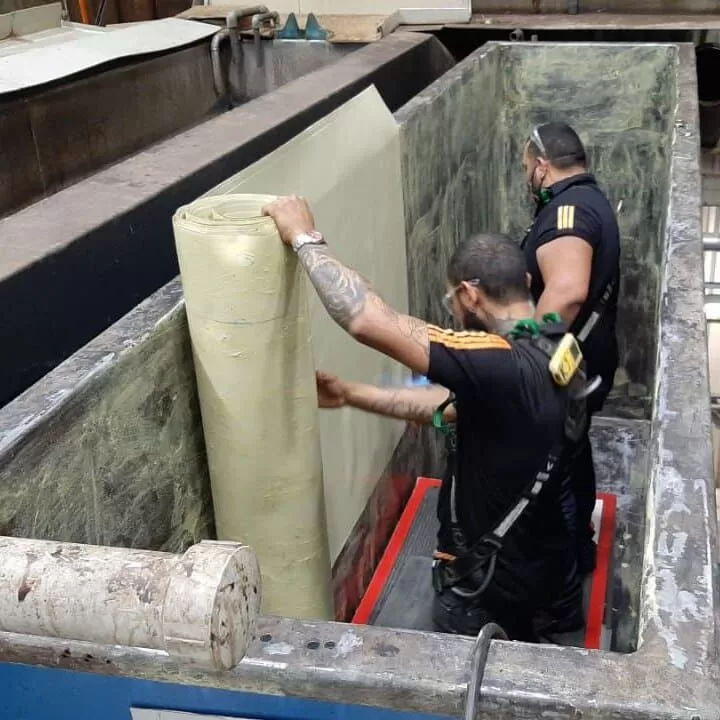 Características técnicas: Revestimento com chapas de PP, PVC ou aplicação de fibra de vidro com resina; execução sob medida conforme geometria e fluido contido no tanque