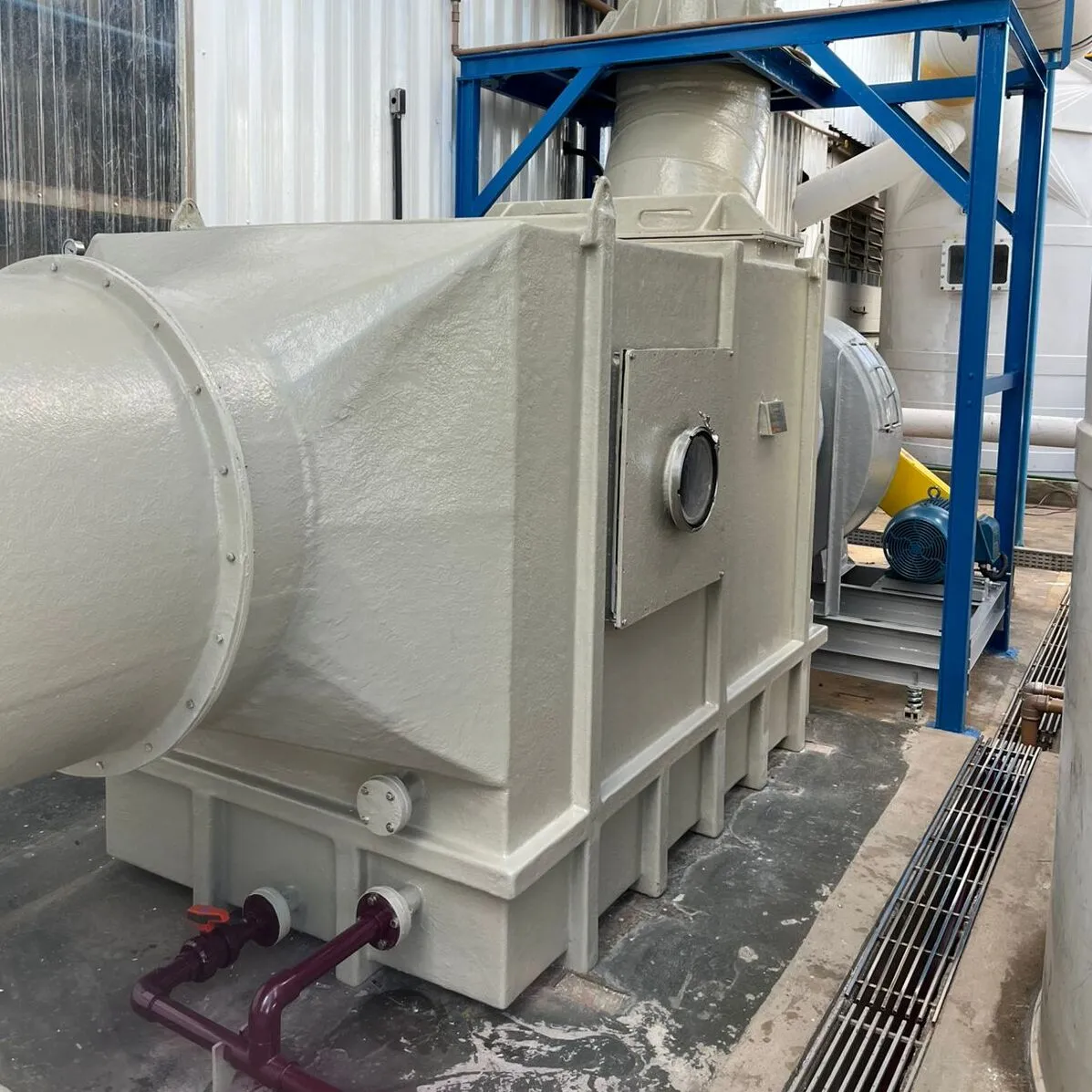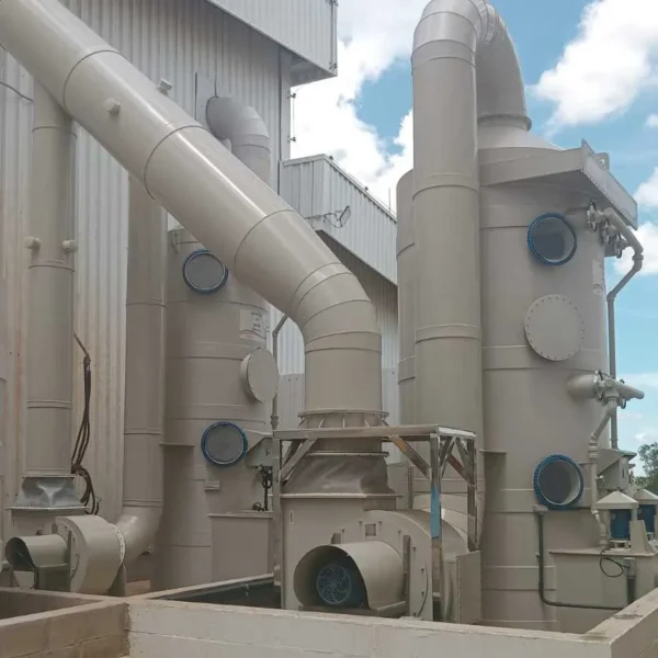 • Configuração técnica: pode integrar torre de lavagem, reservatório, bomba de recirculação, bicos de aspersão, recheio interno, separador de gotas, tubulações e pontos de inspeção.