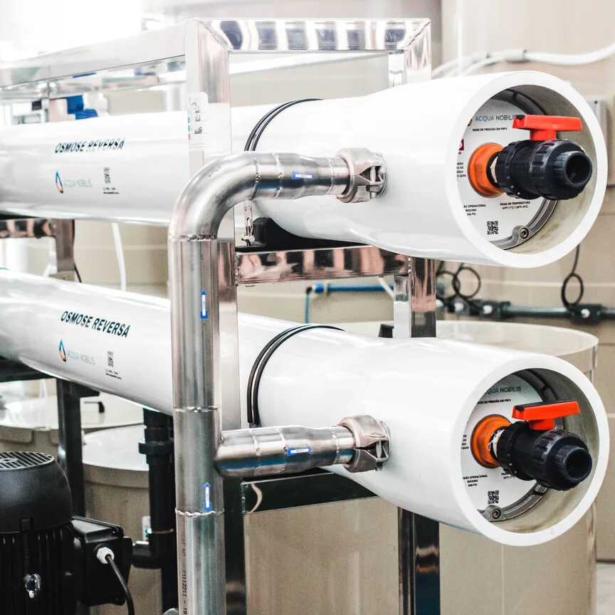 Antes dessa etapa, a água passa por um sistema de pré-tratamento, que pode incluir filtros de areia, carvão ativado ou cartucho, para remover impurezas maiores e proteger as membranas. Após a separação, a água tratada (permeado) segue para o uso, enquanto a fração rejeitada (concentrado) é descartada ou reutilizada, conforme o projeto.